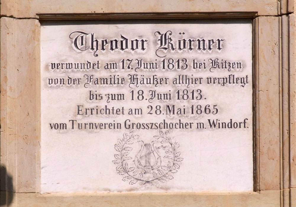 Die Tafel erinnert daran, dass in diesem Haus, dem früheren Gutsgärtnerhaus, der bei einem Überfall durch die Franzosen schwer verletzte Lützower Theodor Körner versteckt und gepflegt wurde. Danach wurde Körner über Elster und Pleiße zur befreundeten Familie Wendler nach Leipzig gebracht. | |