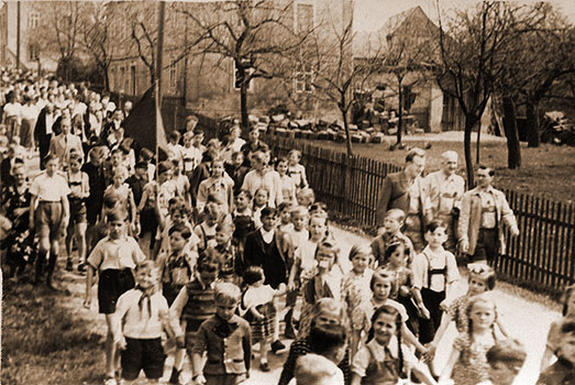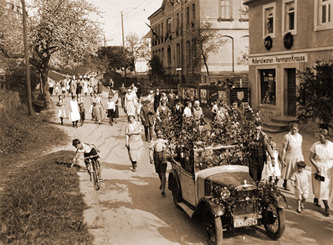 Maiumzug in den 1950-er Jahren an der Einmündung der Hohen Straße in die Martin-Hering-Straße