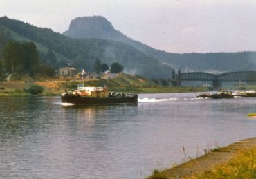 Elbe bei Bad Schandau, im Hintergrund die alte Straßen- und Eisenbahnbrücke und der Lilienstein